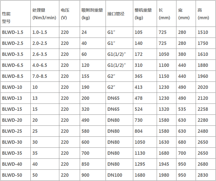 博菱系列无热再生吸附式干燥机选型参数表: